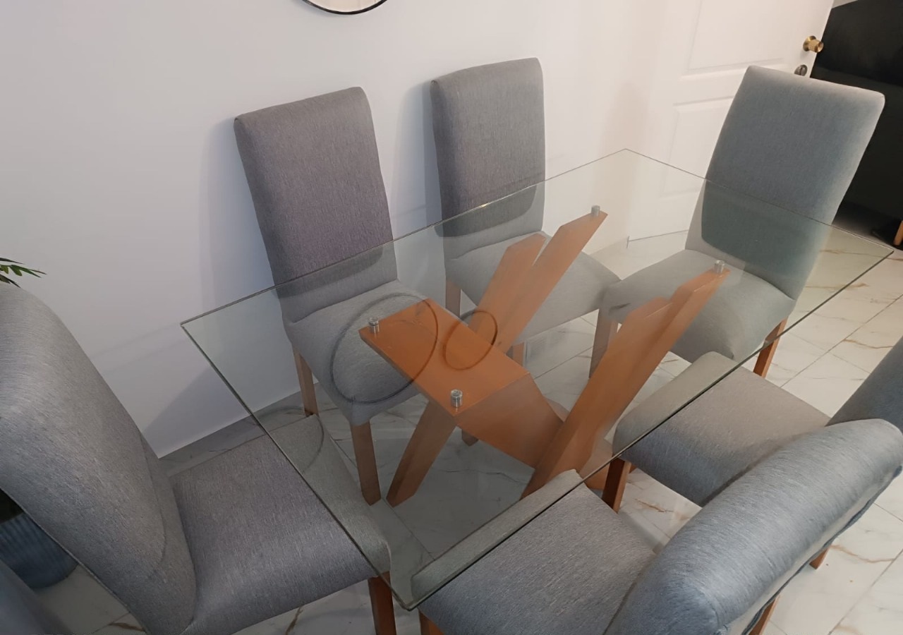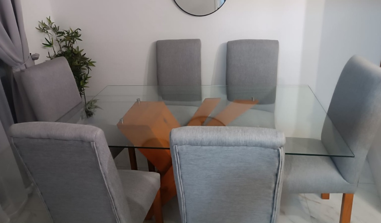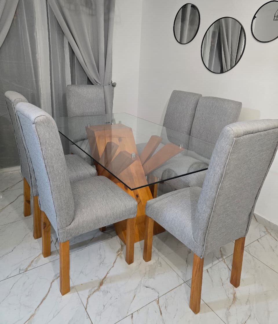 Las seis sillas tapizadas con respaldo liso brindan una mayor comodidad y pueden combinar en cualquier espacio.